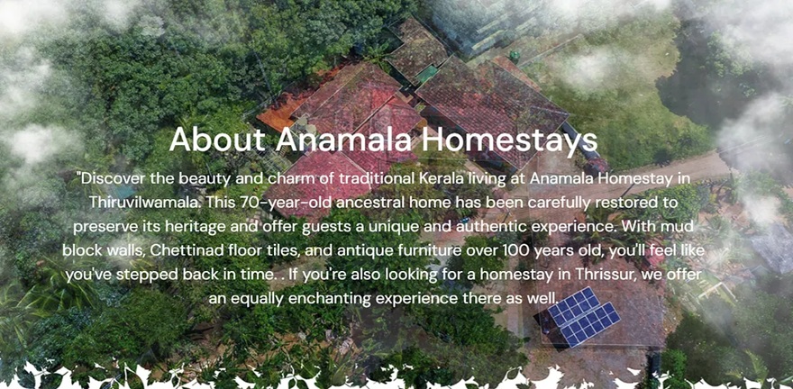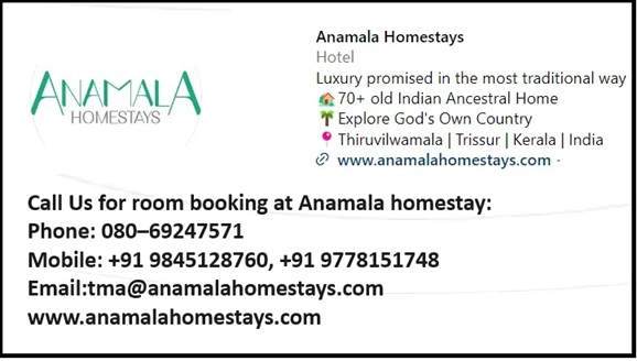 Anamala Homestay is a 70-year-old ancestral home, which is situated at Thiruvilwamala of Thrissur district in Kerala. The Anamala Serenity heritage homestay stands out from other holiday homes due to its antique furniture, wooden ceilings, and windows. The walls are made of mud blocks, and the floor tiles are from Chettinad.