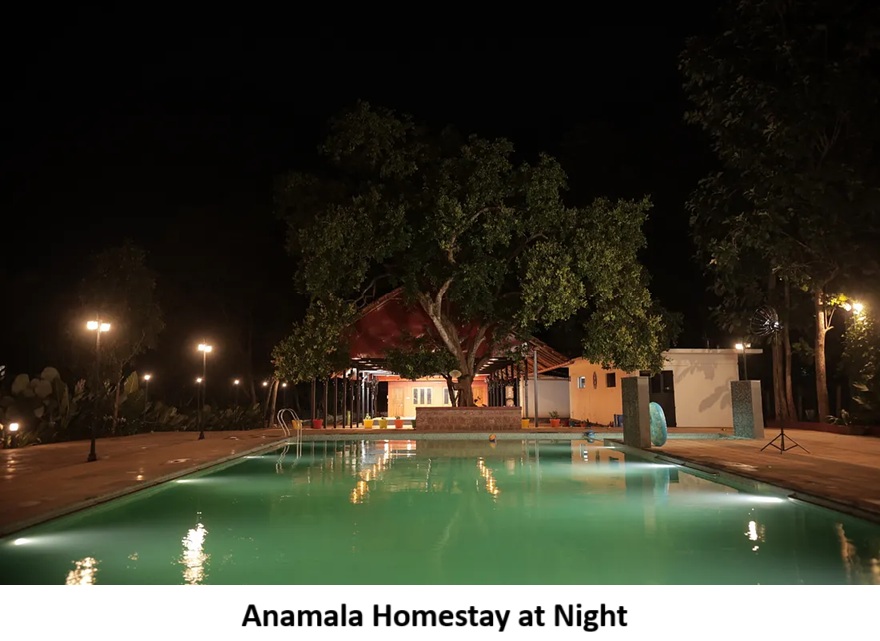 Nestled amidst nature’s embrace, Anamala Homestays sits surrounded by lush eucalyptus and coconut groves. The landscape, adorned by rolling hills, tranquil valleys, and nearby rivers, creates a serene backdrop for a peaceful retreat. It’s an oasis that invites guests to unwind and reconnect with nature’s tranquility. We also have a beautiful swimming pool.