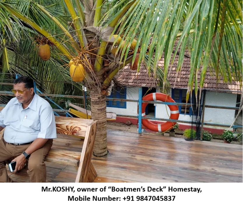 To Book “Boatmen’s Deck” homestay, you can contact Mr.KOSHY, you can reach him via Mobile Number: +91 9847045837