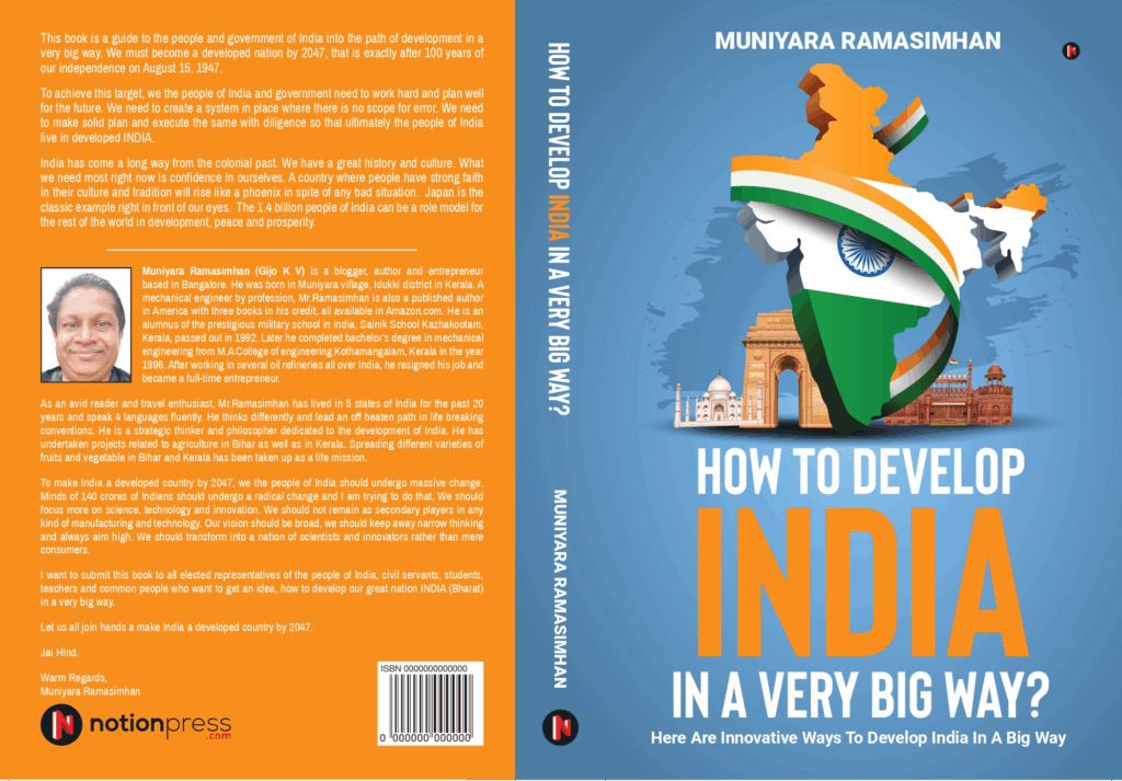My name is Gijo K V, and my pen name is Muniyara Ramasimhan. I am a former Mechanical Engineer and entrepreneur based in Bangalore. I am writing this book to guide the people and government of India into the path of development in a very big way. We must become a developed nation by 2047, that exactly after 100 years of our independence on August 15, 1947. To achieve this target, we the people of India and government need to work hard and plan well for the future. We need to create a system in place where there is no scope for error. We need to make solid plan and execute the same with diligence so that ultimately the people of India live in developed INDIA.